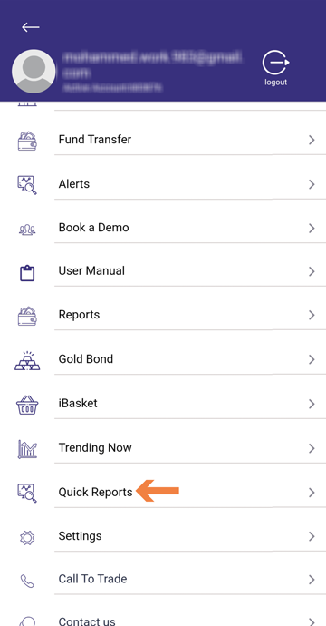 In the Quick Report option, you can view the following reports. Tradebook, Profit & Loss, Portfolio Holdings, Fund statement, Position (Visible for derivative account only) (Filters like date range and segments are available for convenience).